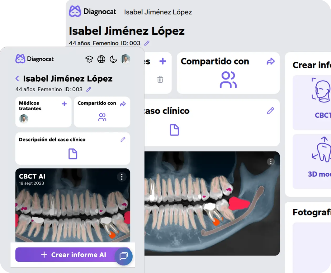 Diagnocat es la solución de inteligencia artificial que analiza tus imágenes dentales en 2D y 3D, convierte datos en conocimiento clínico y te ayuda a optimizar tus flujos de trabajo mientras mejoras la experiencia y los resultados de tus pacientes.