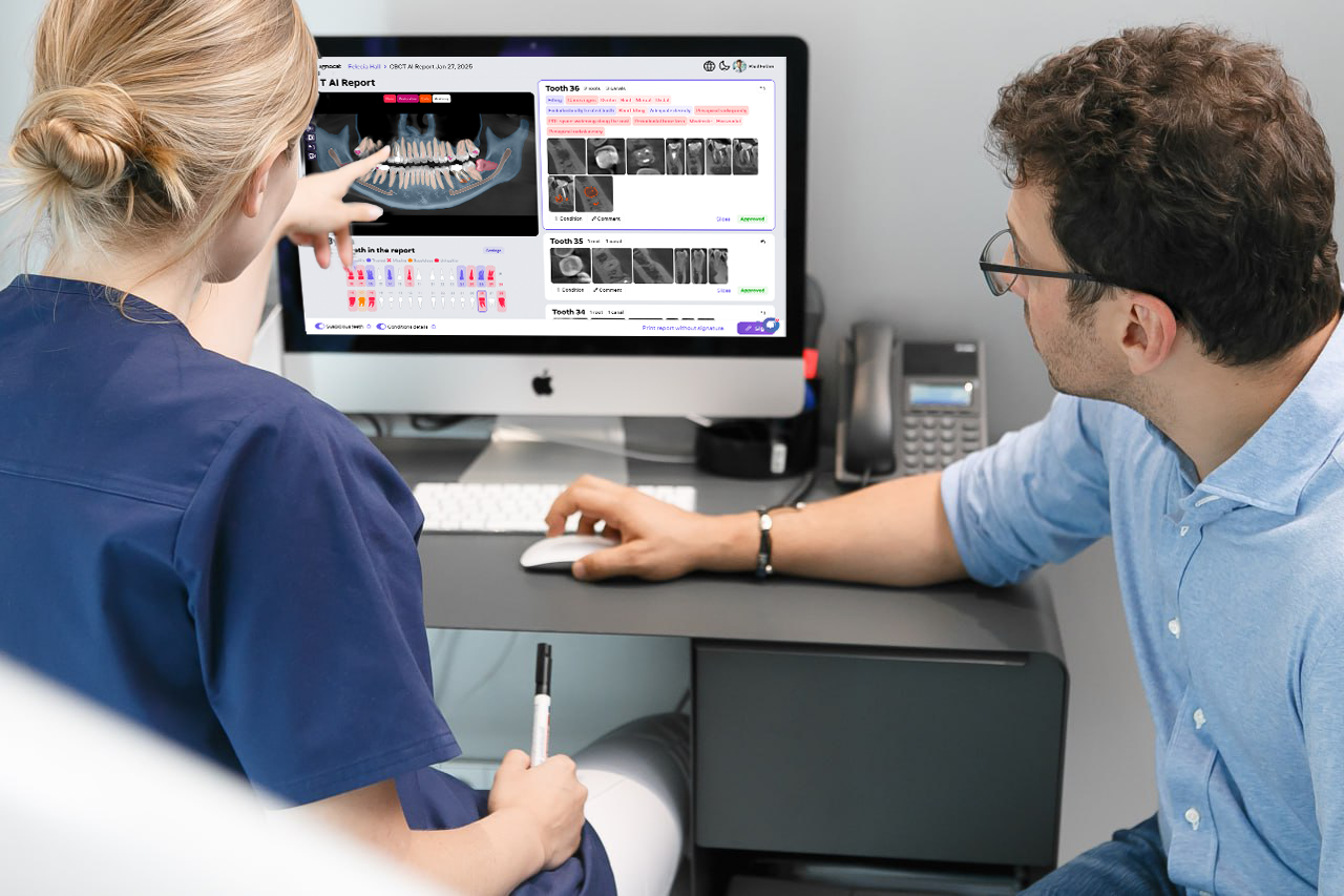 Diagnocat proporciona informes claros y detallados de imágenes CBCT, panorámicas e intraorales. Contarás con el apoyo de reportes visuales y comprensibles que facilitan la comunicación, disminuyen la ansiedad y motivan a la aceptación del tratamiento.